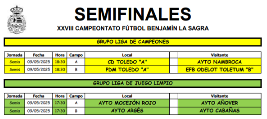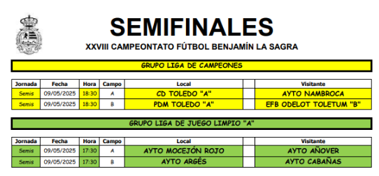 El XXVIII Campeonato de Fútbol Benjamín “La Sagra” ya conoce a los equipos semifinalistas tras la disputa de la última jornada de la Segunda Fase, quedando definidos los cruces que decidirán a los finalistas del torneo.