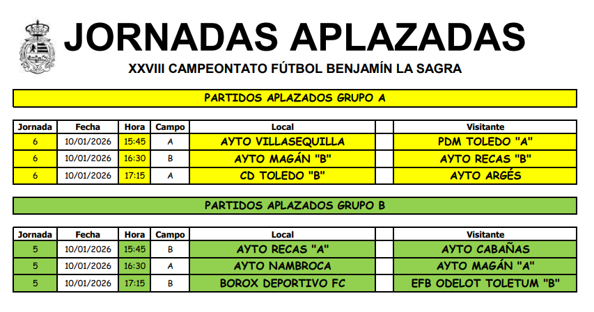 El XXVIII Campeonato de Fútbol Benjamín “La Sagra” vivirá mañana una jornada especial dedicada exclusivamente a la disputa de los partidos aplazados hasta la fecha.
